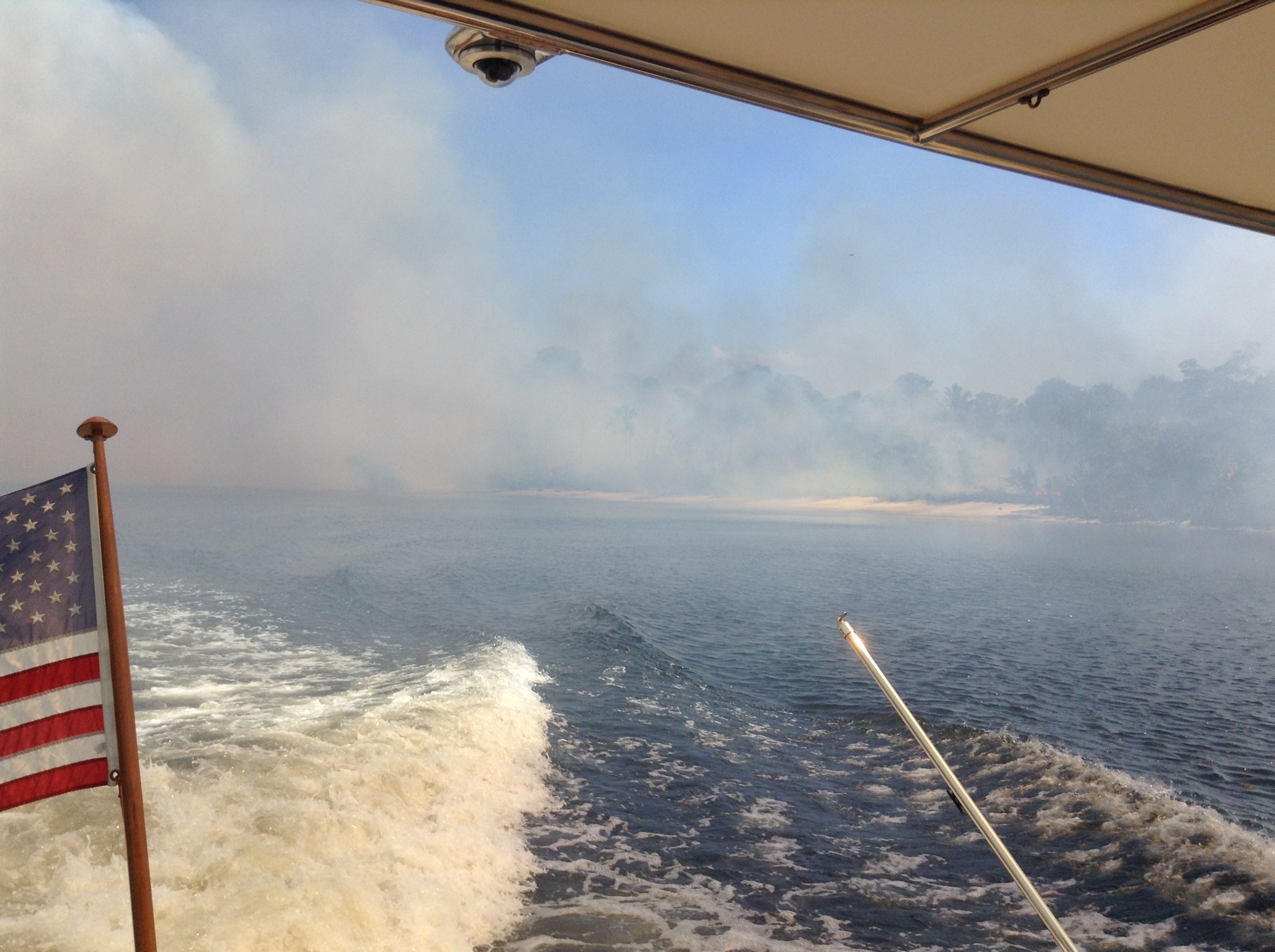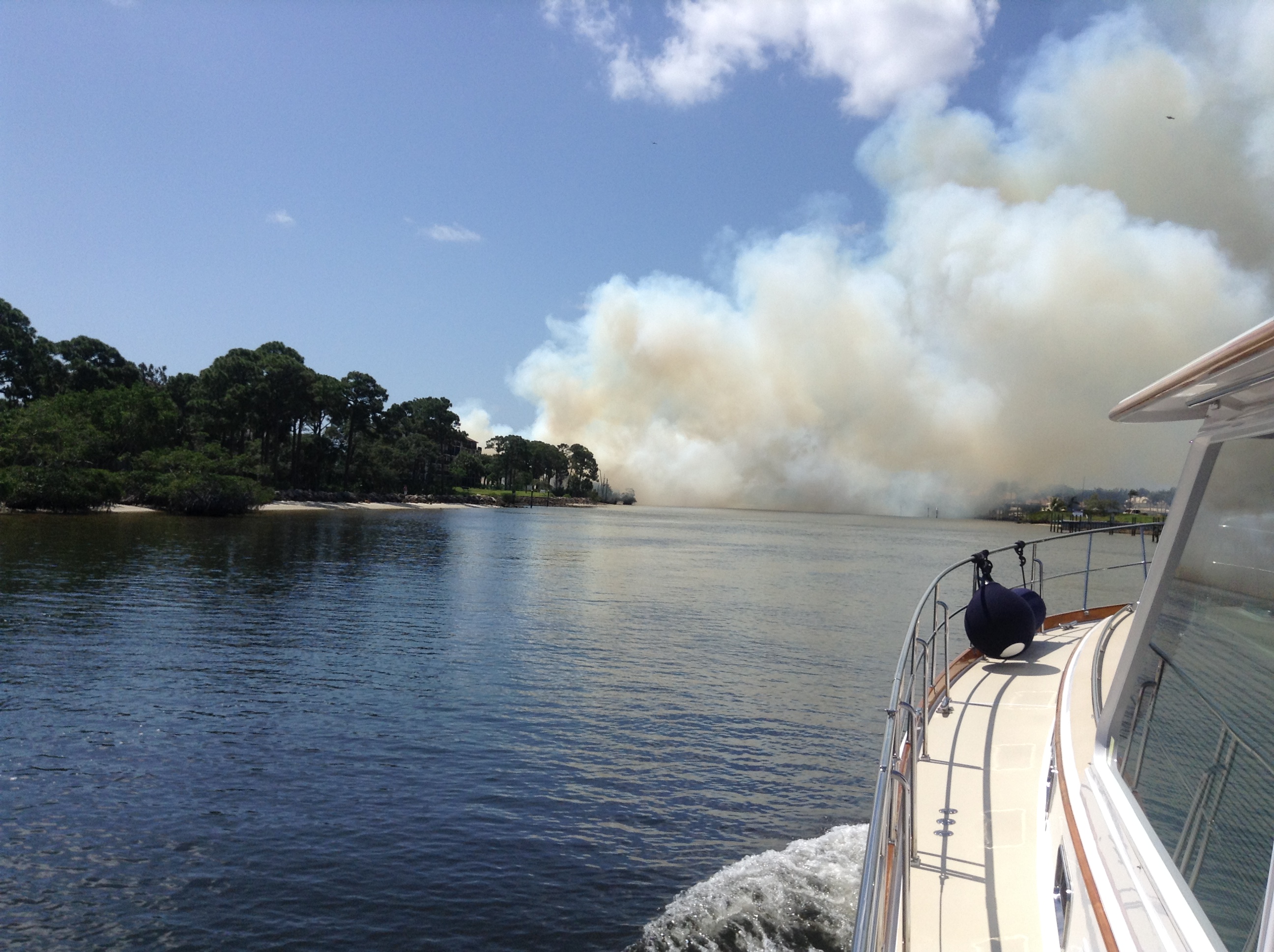 The closer we get and the sooner we have come around the bend in our channel, the more evident it is. It is some serious fire and the alerts through the VHF are clarifying it being a forest fire that is under control and well tended to by the Fire Department of Jupiter. Does not seem to be as much under control to us as we have to pass through some serious smoke and our visibility has been cut to zero. As we alert other vessels approaching our location from any direction so are they alerting us to their presence as well. All eyes on deck and peeled to the windshield! Engines going at a creeping speed! No chances taken here, that is for sure!