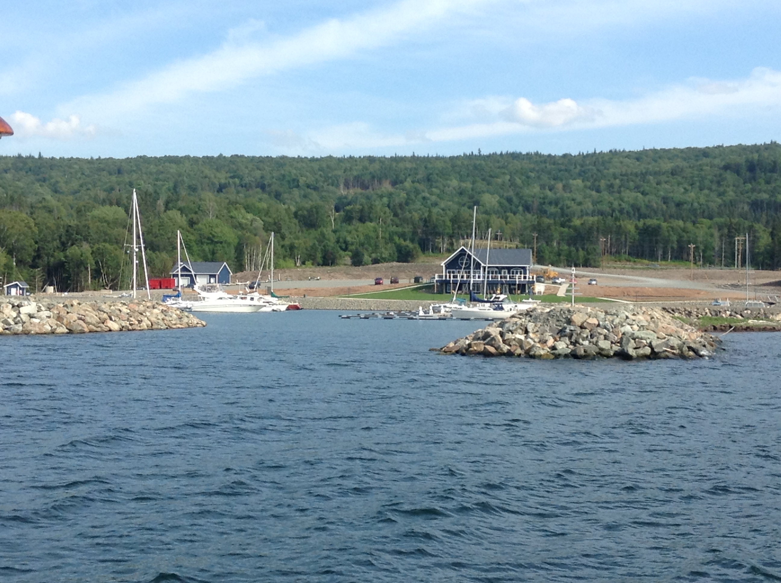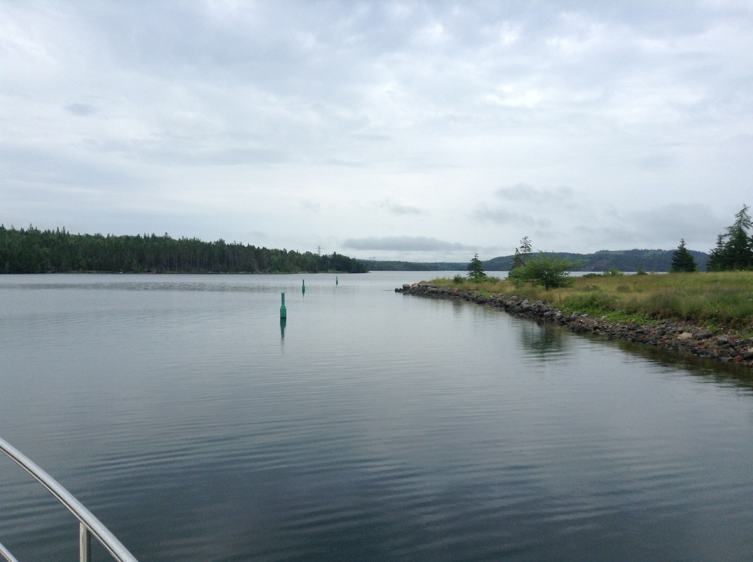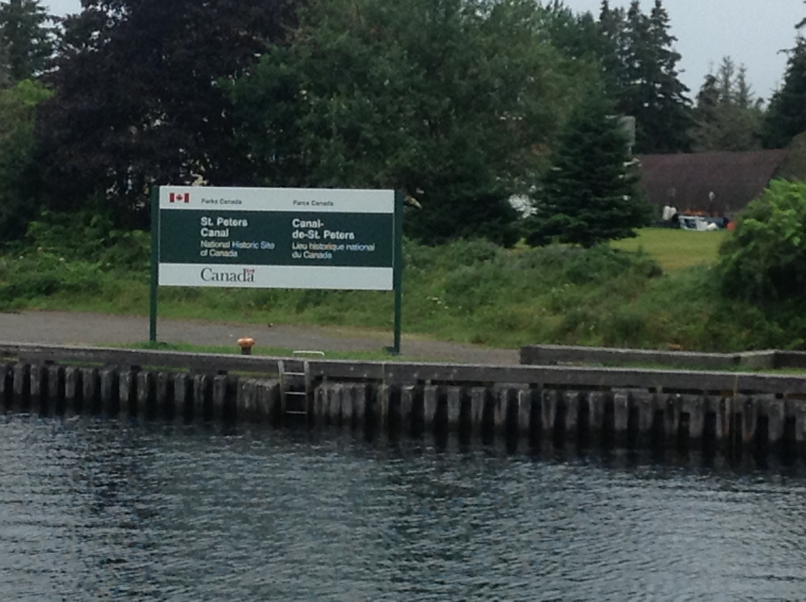 Late in the day of our 80 NM run from Pictou and through the Sraits of Lennox we came upon the invisible lock of St Peters. If you didn’t know or have a chart you would never see the entrance to this beautiful lock amidst well carved and rounded rocks and pine trees reaching all the way to the water lies in it’s tranquility this small lock leading into the lower part of Bras D’Or lake. Breathtakingly beautiful and so calming it is here. Even though it rained again everything was fine and calm. We tied up at the Warf of the fuel dock of St. Peter’s Marina. This is home now for a day and two nights possibly.