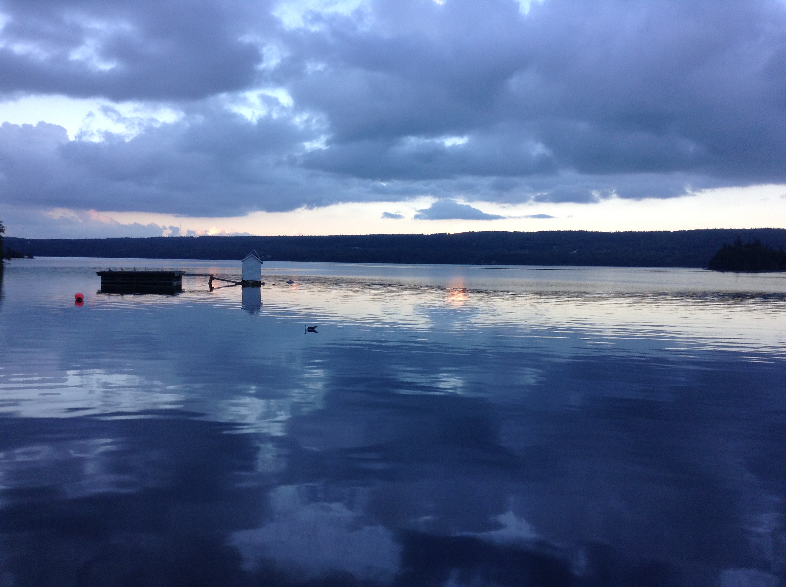 Joe got to watch his race at the marina TV and I walked around the sports field while being greeted and inventively observed by a beautiful rabbit and three squawking ravens on top of power poles. It was a mellow and cool evening at the lake till out views were obstructed by the arrival of a 120 foot big yacht that was docking for the night before their early morning departure to Halifax.