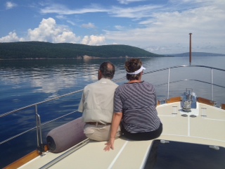 It is an amazing day on this great lake and we are using the time to glide slowly but deliberately through tranquil waters with a slight breeze pushing us from behind. Finally it got so warm that a bathing suite is a must as is my favorite seat up on the bow with a good book to read and or gaze up on to the rolling hills as we pass by them. The water is so clear and there is a sent of freshness in the air. Thank God for this beauty and the awareness of it all!